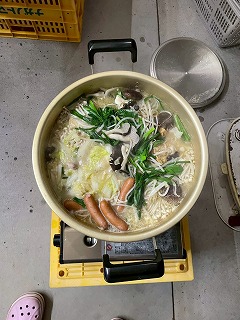 夜は「とり野菜味噌」の鍋を作っていただきました。雨ちゃん合流。